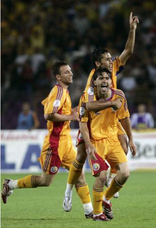 Romunski nogometaši, Cosmin Contra, Paul Codrea in Razvan Rat, se vesleijo gola in zmage. (Foto: Reuters)