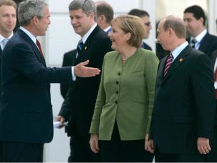 Z leve: George W. Bush, kanadski predsednik vlade Harper, Angela Merkel in Vladimir Putin, so bili pred enim od sestankov zelo dobro razpoloženi.