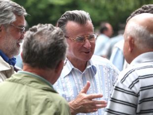 Vodja poslanske skupine SD Miran Potrč (v sredini) med živahnim pogovorom z drugimi piknika v Mostecu, Dušanom Kumrom, Marjanom Rožičem in Janezom Kocijančičem. (Foto: Sta)