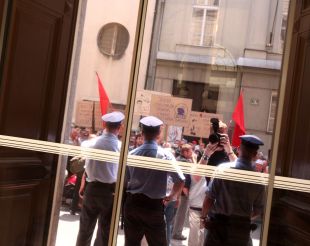Poslopje vlade so varovali policisti, vseeno pa so protestniki uspeli izročiti pismo za predsednika vlade Janeza Janšo. (Foto: Sta)
