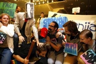 Nekaj deset študentk in študentov je v preddverju Cankarjevega doma uprizorilo javno vladno masiranje družbenih skupin. Akcijo je pripravila in izvedla Avtonomna tribuna študentov. (Foto: Sta)