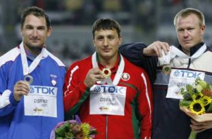 Svetovni prvak iz Belorusije Ivan Tihonov (v sredini), Primož Kozmus (levo) in Slovak Libor Charfreitag so najboljši metalci kladiva na svetu. (Foto: Reuters)