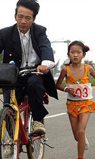 Njen oče, Zhang Huimin, je hčerko maratonko celo pot spremljal na kolesu...
