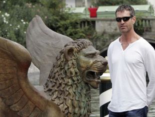 Britanski igralec Rupert Everett ponosno pozira ob slovitem simbolu beneškega festivala, zlatemu levu.