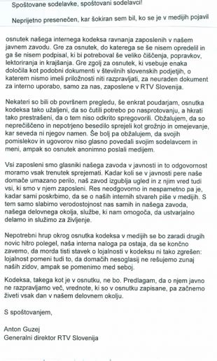 Dejstvo, da se je interni kodeks RTVS znašel v medijih, naj bi povsem šokiralo generalnega direktorja Antona Guzeja, ki je zaposlenim poslal pismo z obrazložitvijo, da gre za osnutek.