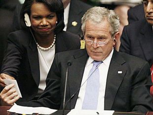 Ponavadi mu plonk listek pridrži njegova zvesta Condoleeza Rice.