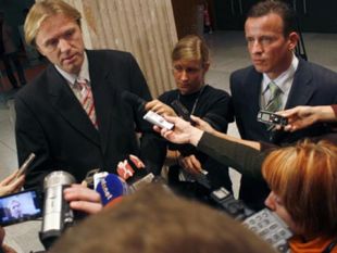 Prvaka Zares, Gregor Golobič (levo), in SLS Bojan Šrot sta med Janševim govorom kar skupaj odgovarjala na novinarska vprašanja.