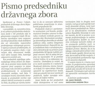 Odgovorni urednik Dela Janez Markeš je Francetu Cukjatiju poslal zelo ostro pismo, v katerem je obsodil ponedeljkov govor premiera.