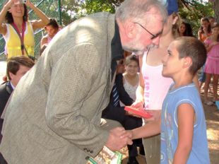 Mali fantiček, ki se pozdravlja z našim zunanjim ministrom g. Ruplom je videti, da odrašča v prijaznega diplomata. Ko bo zrasel bo zadevo reševal. Stvari zorijo počasi.